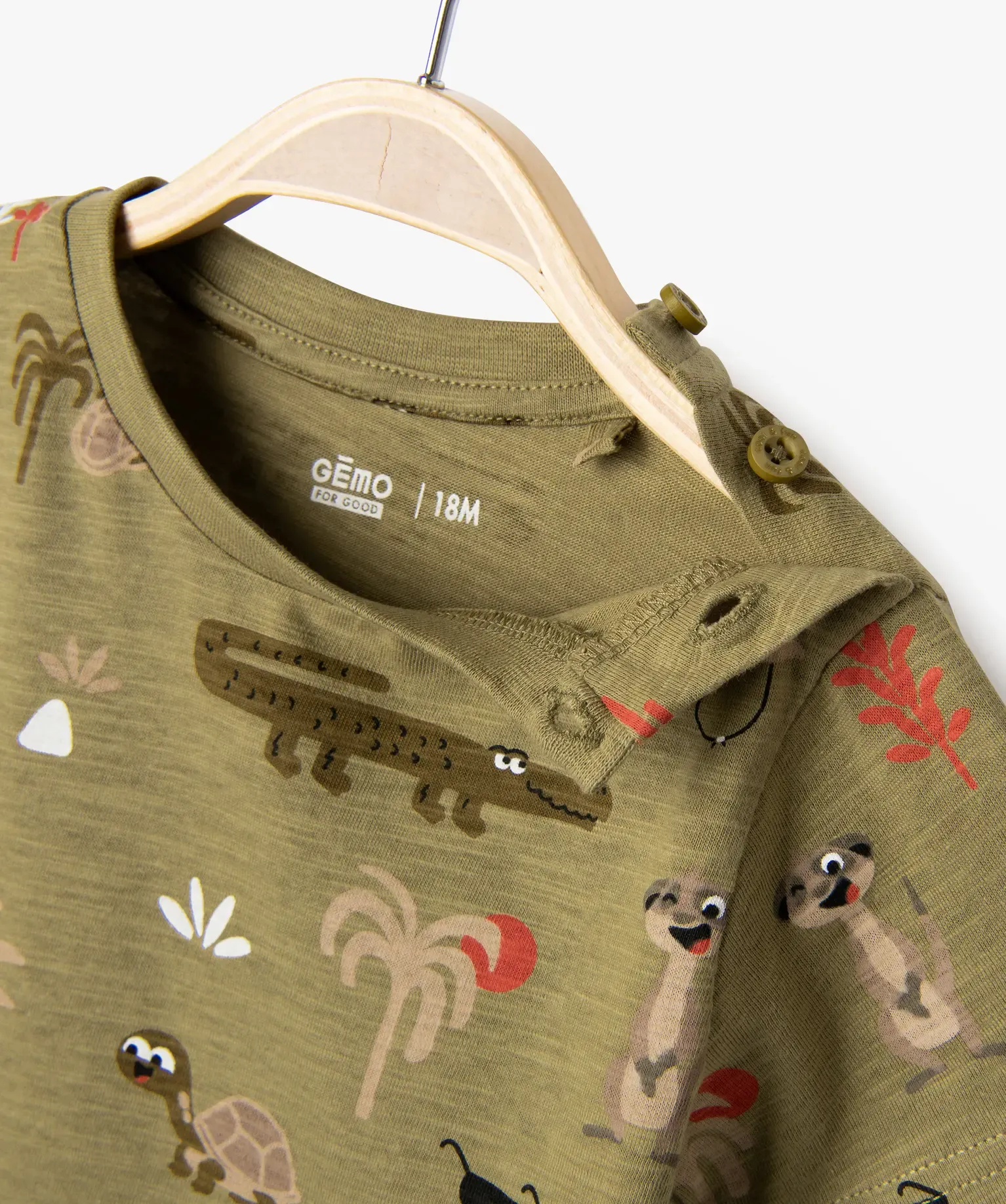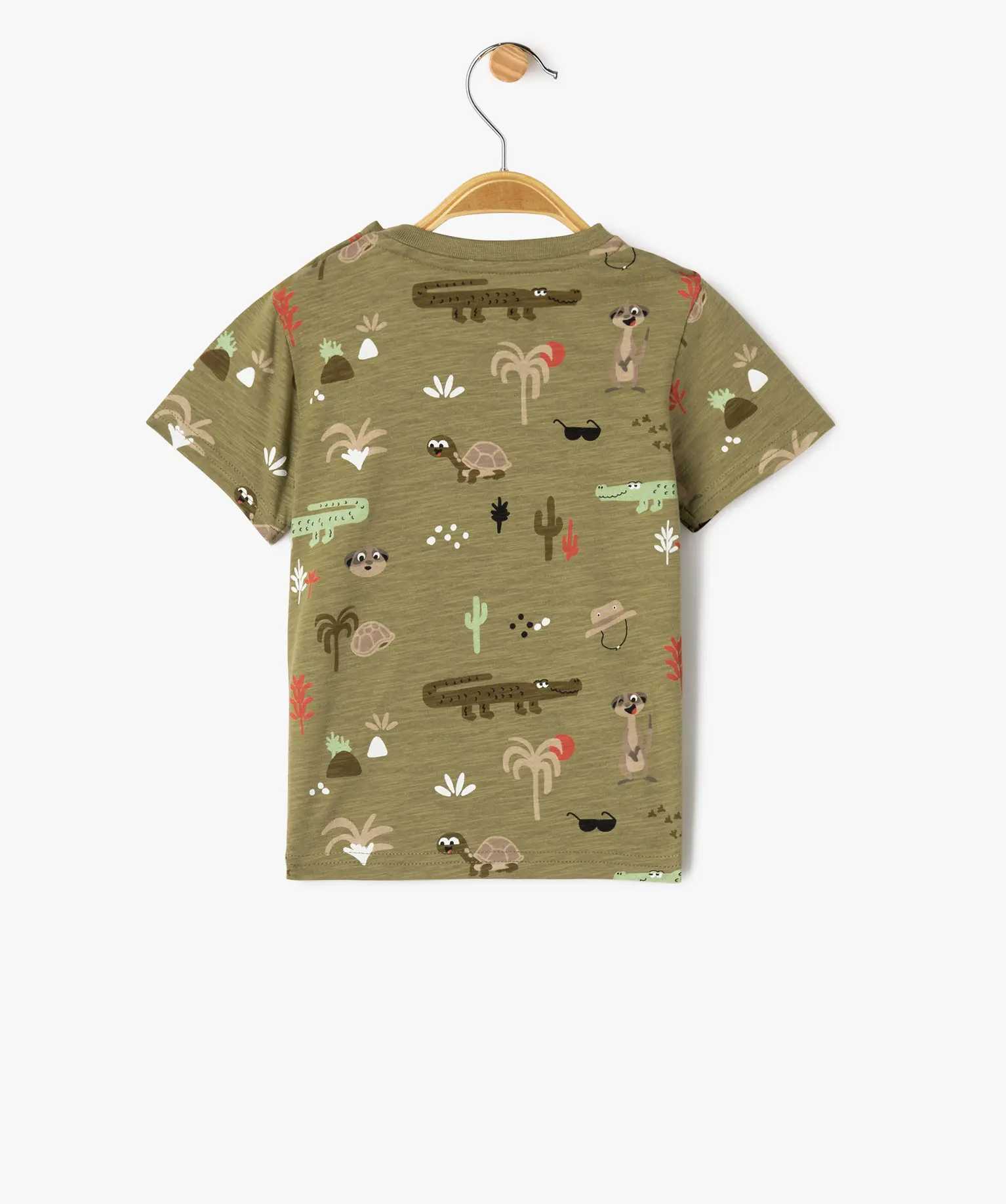 Un modèle entièrement décoré de motifs exotiques parmi lesquels cactus, palmiers et animaux de la savane. Ce tee-shirt à manches courtes possède un col rond qui s’élargit grâce à deux boutons sur l’épaule.